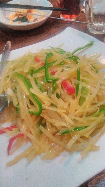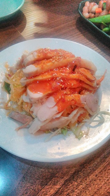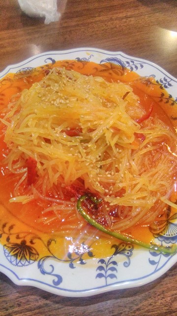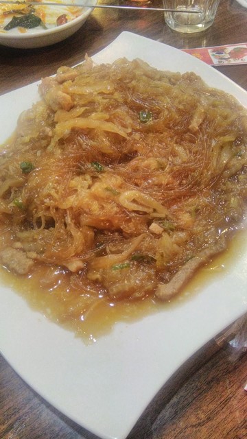 で、ちびりちびりとやりながら、老虎菜を。虎がいない・・。辛くない~。香菜もなんか香りが弱いというか、臭みがすくなくてマイルドすぎ。拉皮は自家製らしい。ちょっと太すぎ?笑 まあ、これはこれで歯ごたえあっていいけど。でもだいぶ日本的にアレンジしてるのかな~、パンチが弱い感じ。