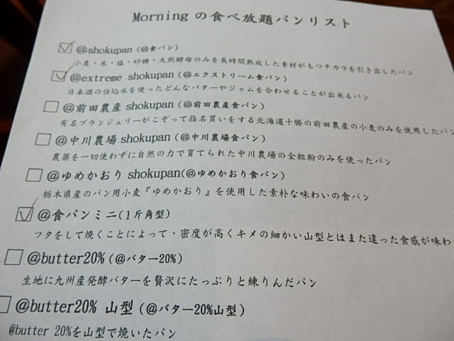 が、食べ放題といっても全種類食べられるわけじゃありませんでしたの。それ、知らなかった・・・。今日食べられるのは三種類のみ。でもって私が食べたかったのは発酵バターの食パンだったのだけれど、さすがにあれだけお値段する食パンは食べ放題にはでませんかね。