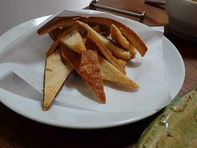 パンの耳のラスクがサービス。黒こしょうがきいててこれはビールにもあいますね♪