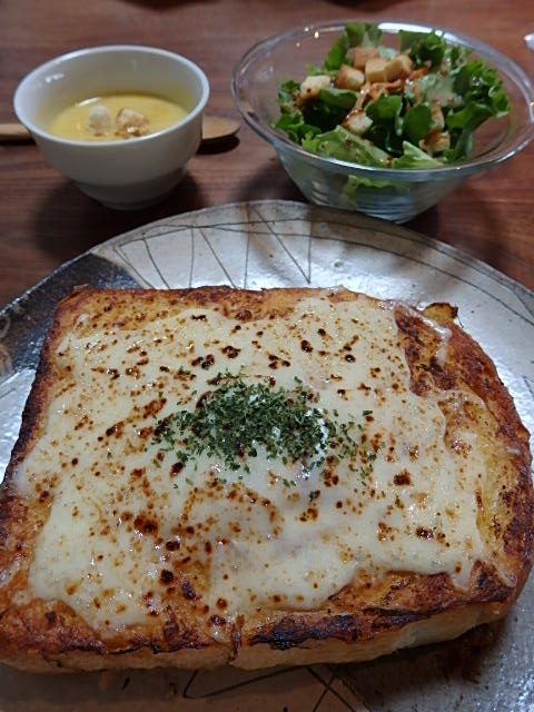 クロックマダムはハムと卵がパンのなかにはいってる!パン二枚ではさむのじゃなくて、厚切り一枚の中身だけくりぬいてつめてるみたい。斬新。チーズも濃厚でおいしいです~。