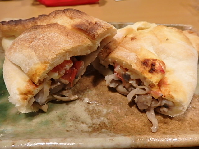 ↑こちらは別の時にかった三種のキノコのカルツォーネ。これもキノコたっぷりでおいしいですが、軍配はホタテにあがりますね。