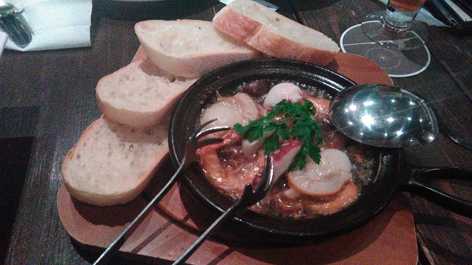 このアヒージョは最高においしかった!ソースをパンにつけて食べたらとまらない、とまらないっ!