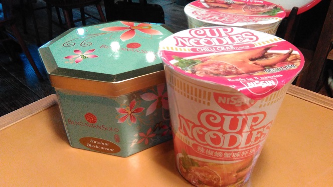 そして、同じくBengawan Soloのクッキー。ヘーゼルナッツとブラックカラントのクッキーは甘すぎなくて珈琲によくあうのです♪ で、今回一番感激したのが隣のカップヌードルチリクラブ味!も~びっくり!本当にチリクラブの味わいです。辛い!うまい♪これはお土産にお勧め!!